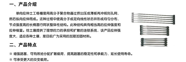 單向拉伸的土工格柵是由高分子聚合物經(jīng)擠出壓成薄板再沖規(guī)則孔網(wǎng),然后縱向拉伸而成。這種過程中使高分子成定向線性狀態(tài)并形成分布均勻、節(jié)點強度高的長 橢圓形網(wǎng)狀整體性結(jié)構(gòu)。此種結(jié)構(gòu)具有相當高的拉伸強度和拉伸模量,特別是我公司此類產(chǎn)品更具有超國際水平的高早期(伸長率在2%—5%)拉伸強度和拉伸模 量。給土壤提供了理想的力的承擔和擴散的連鎖系統(tǒng)。該產(chǎn)品拉伸強度大(>150Mpa),適應各種土壤,是目前廣為采用的加筋加固材料。